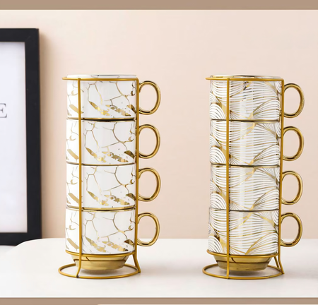 AA0023 TAZA CERAMICA X 4 APILABLE BLANCO CON DORADO