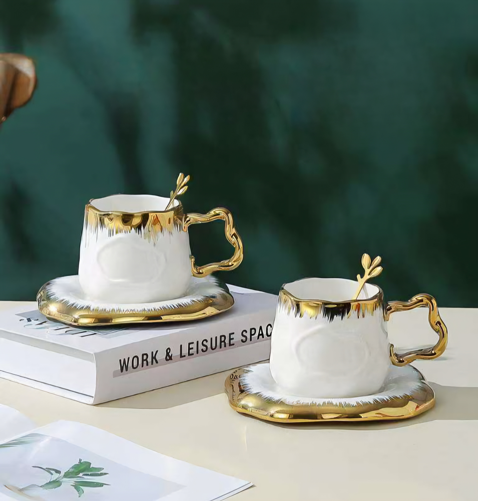 AA1417 TAZA CON PLATO CERAMICA BLANCA CON DORADA